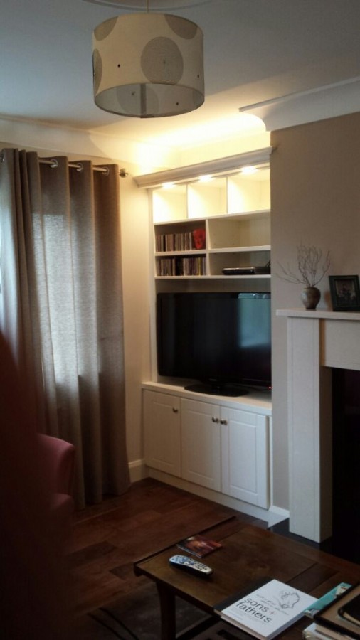 Painted living room TV/Display unit with LED downlights.